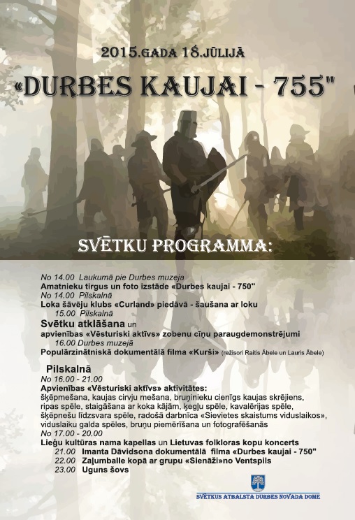 2015. gada 18. jūlijā Durbē ar atraktīvām nodarbēm (loka šaušanu, zobenu cīņas paraugdemonstrējumu, bruņinieku kaujas skrējienu, radošo darbnīcu "Sievietes skaistums viduslaikos", viduslaiku galda spēlēm, bruņu piemērīšanu), amatnieku tirgu, dokumentālām filmām, koncertu un citām aktivitātēm atcerēsies Durbes kaujas 755. gadadienu.