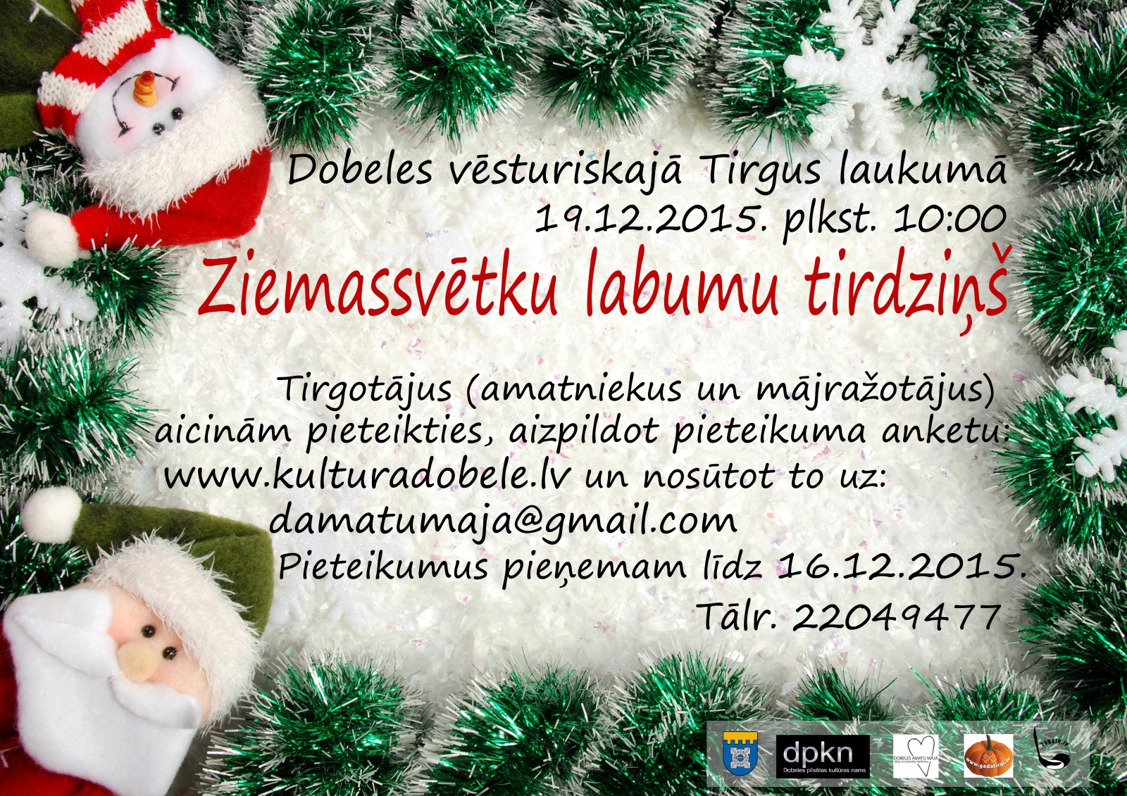 Datums: 19. Decembris, 2015Reģions: ZemgaleVieta: Dobeles vēsturiskais tirgus laukumsAdrese: Skatīt karti lielākā izmērā Kontaktinformācija: Eva Kulmane, tālr. 22049477, e-pasts damatumaja@gmail.comReģions filtram: Dobeles novads