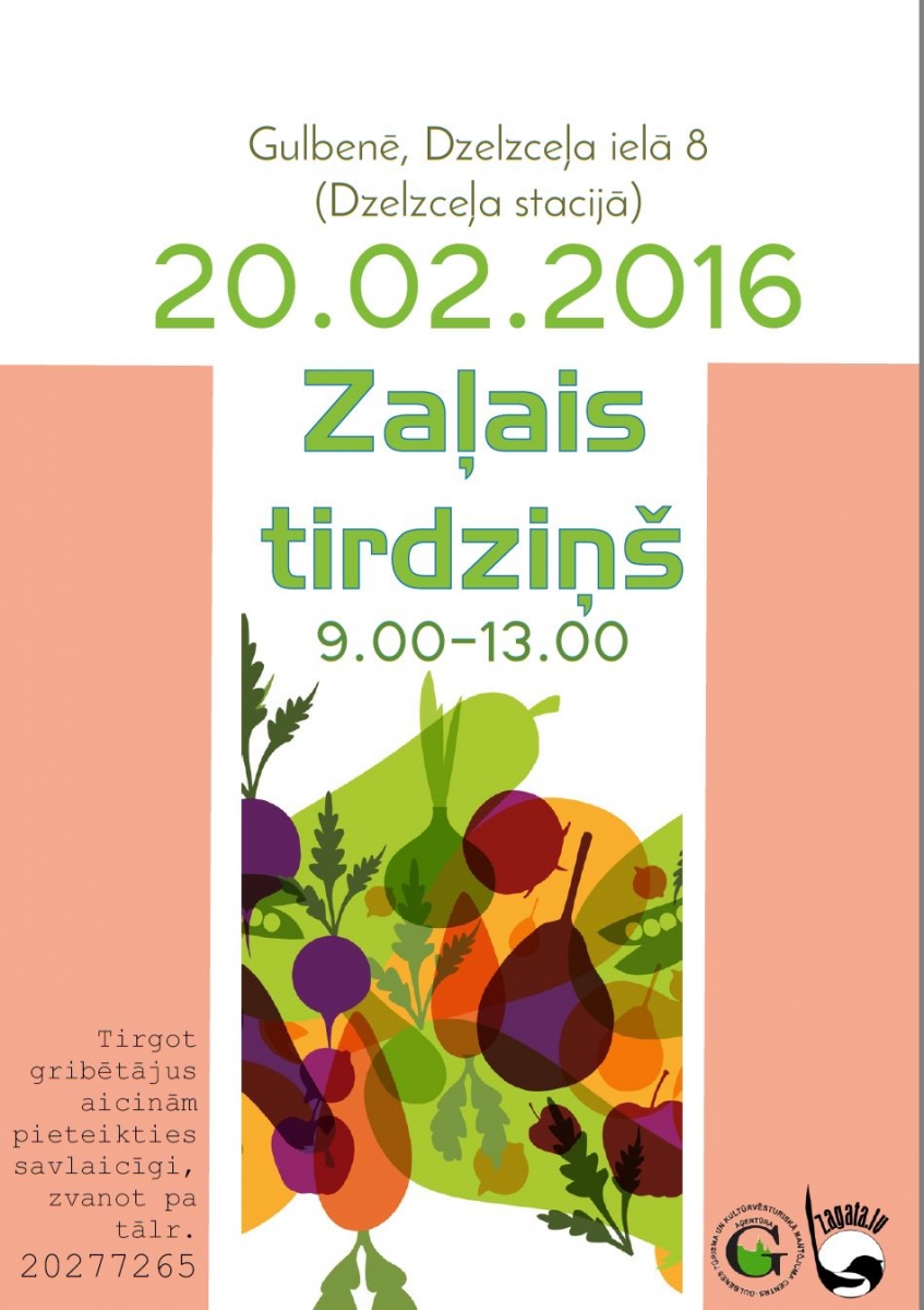 Datums: 20. Februāris, 2016Reģions: VidzemeVieta: Dzelzceļa stacijaAdrese: Skatīt karti lielākā izmērā Aicinām pieteikties uz Zaļo tirdziņu, Gulbenē, Dzelzceļa stacijā, Dzelzceļa ielā 8, 20. februārī Kontaktinformācija: tālr. +371 20277265Reģions filtram: Gulbenes novads