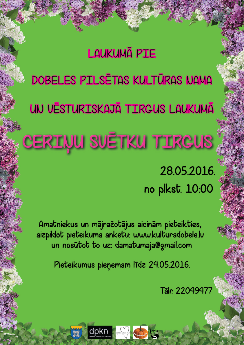 Amatniekiem un mājražotājiem dalībai tirgū pieteikšanās līdz 24. maijam, aizpildot pieteikuma anketu www.kulturadobele.lv/pieteikuma anketa tirdziņam un sūtot to uz e-pastu damatumaja@gmail.com