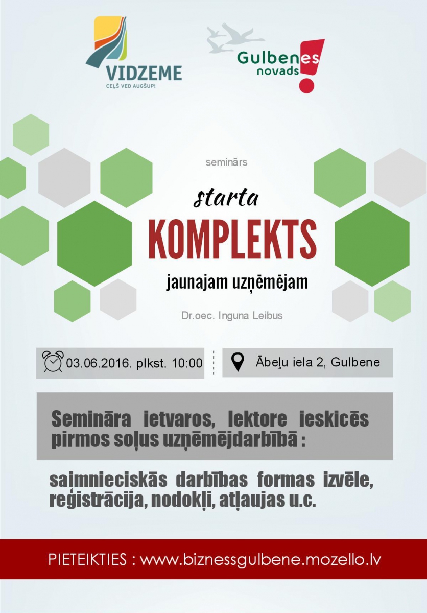Informatīvs seminārs jaunajiem uzņēmējiem. Semināra ietvaros ieskicēs pirmos soļus uzņēmējdarbībā - saimnieciskās darbības formas izvēle, reģistrācija, nodokļi, atļaujas u.c. starta komplekts jaunajam uzņēmējam.