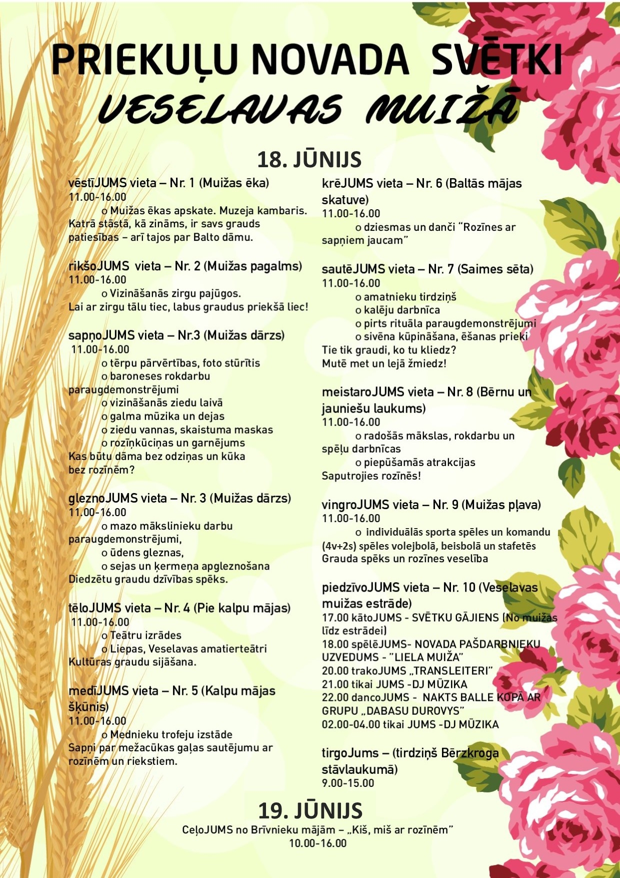 Priekuļu novada svētki Veselavas pagastā un muižā “Graudi un rozīnes” notiks divu dienu garumā - 18. un 19. jūnijā. Sestdien, 18. jūnijā aktivitātes sāksies no plkst.11:00, kur interesenti varēs apmeklēt 9 dažādas pieturvietas līdz pat 16:00 pēcpusdienā. Diena būs aizraujoša kā maziem, tā lieliem. Savukārt svētdien, 19. jūnijā varēs doties ekskursijā.