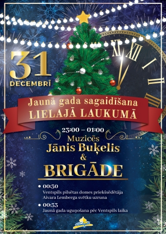 31.decembrī jau no plkst. 23.00 aicinām visus ventspilniekus un pilsētas viesus pulcēties Lielajā laukumā, lai kopā atskatītos aizgājušā gada notikumos bildēs, smeltos enerģiju mūzikā Jāņa Buķeļa & BRIGĀDES vadībā.