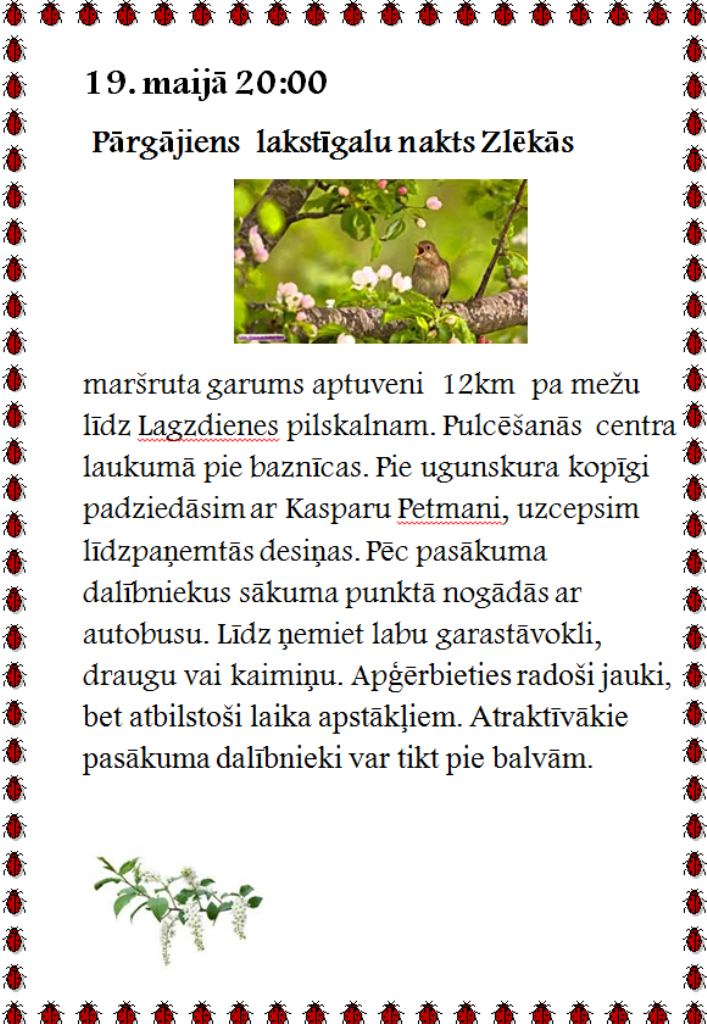 19. maijā plkst. 20.00 Zlēkās sāksies pārgājiens "Lakstīgalu nakts".