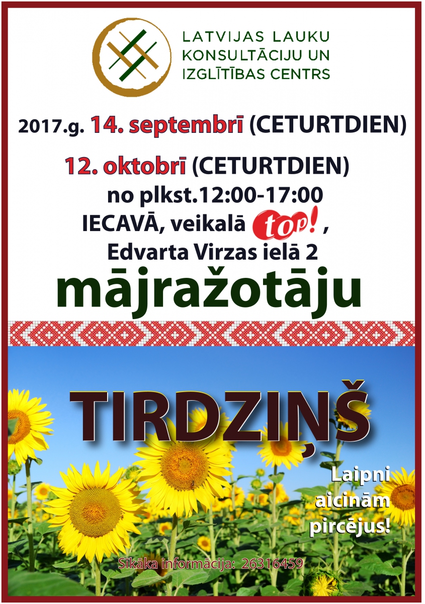 Datums: 14. Septembris, 2017Reģions: ZemgaleVieta: Top! veikalsAdrese: Skatīt karti lielākā izmērā Kontaktinformācija: Raimonda Ribikauska, tel. 26316459, e pasts:raimonda.ribikauska@llkc.lvReģions filtram: * Iecavas novads