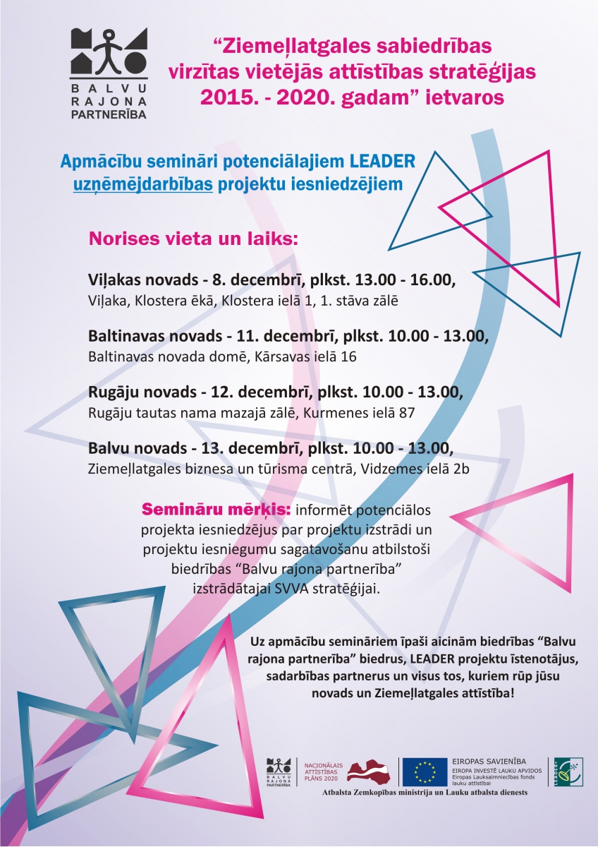 Semināru mērķis: informēt potenciālos projekta iesniedzējus par projekta izstrādi un projektu iesniegumu sagatavošanu atbilstoši biedrības “Balvu rajona partnerība” izstrādātajai SVVA stratēģijai.