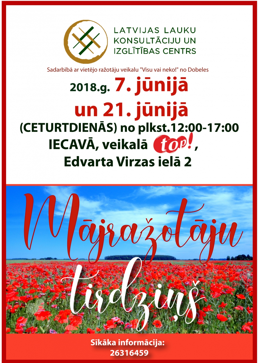 Datums: 7. Jūnijs, 2018 līdz 21. Jūnijs, 2018Reģions: ZemgaleVieta: Top! veikalsAdrese: Skatīt karti lielākā izmērā Kontaktinformācija: Raimonda Ribikauska, tel. 26316459, e pasts:raimonda.ribikauska@llkc.lvReģions filtram: * Iecavas novads