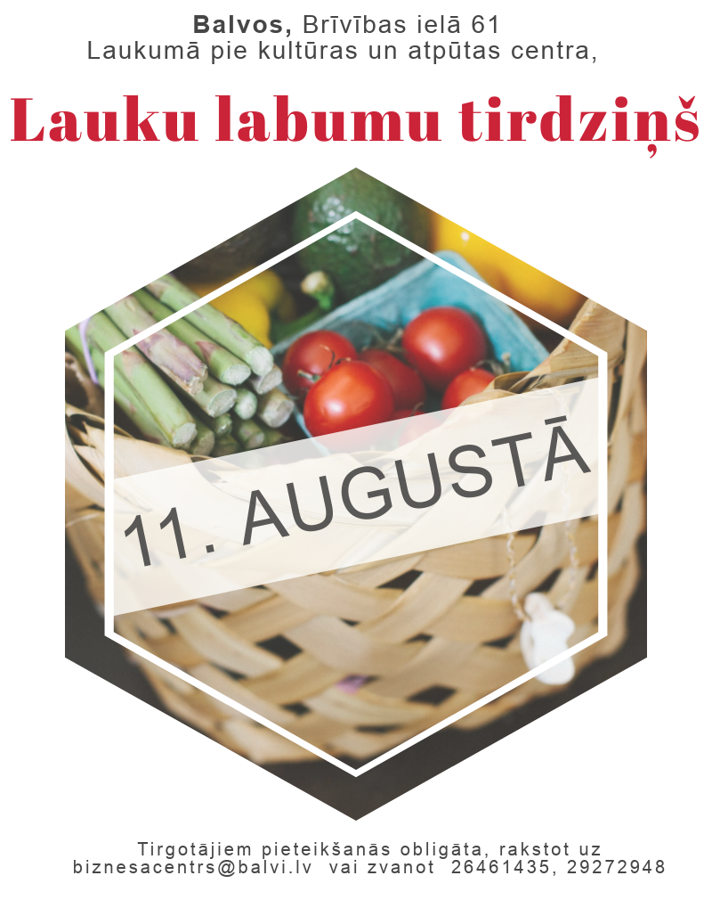 11.augustā Balvos, laukumā pie Balvu Kultūras un atpūtas centra notiks tradicionālais lauku labumu tirdziņš. Aicinām ikvienu apmeklēt tirdziņu, lai iegādātos dažādus lauku labumus un amatniecības izstrādājumus no zemniekiem, mājražotājiem un amatu meistariem!