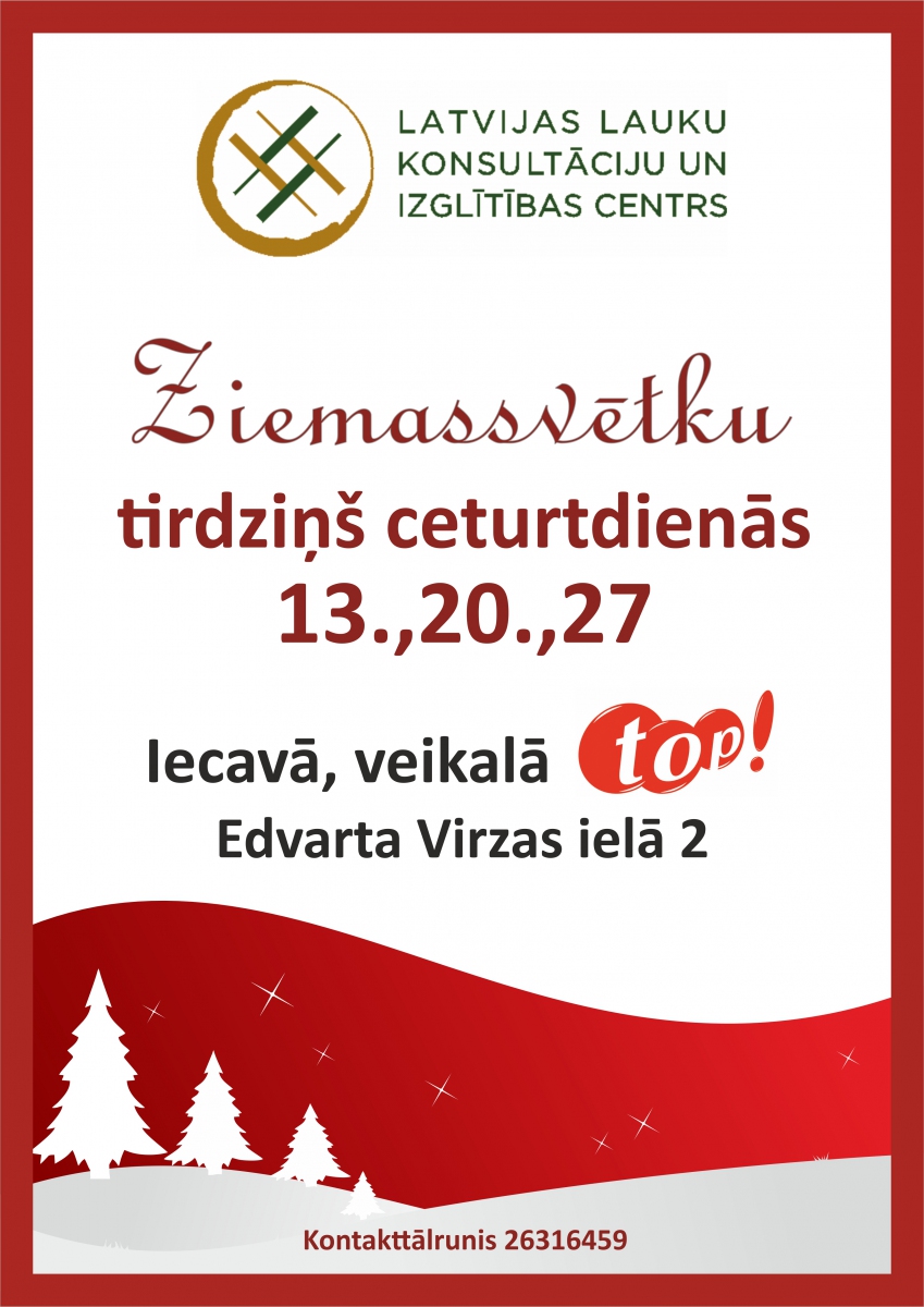 Datums: 13. Decembris, 2018 līdz 27. Decembris, 2018Reģions: ZemgaleVieta: Top! veikalsAdrese: Skatīt karti lielākā izmērā Kontaktinformācija: Raimonda Ribikauska, tel. 26316459, e pasts:raimonda.ribikauska@llkc.lvReģions filtram: * Iecavas novads