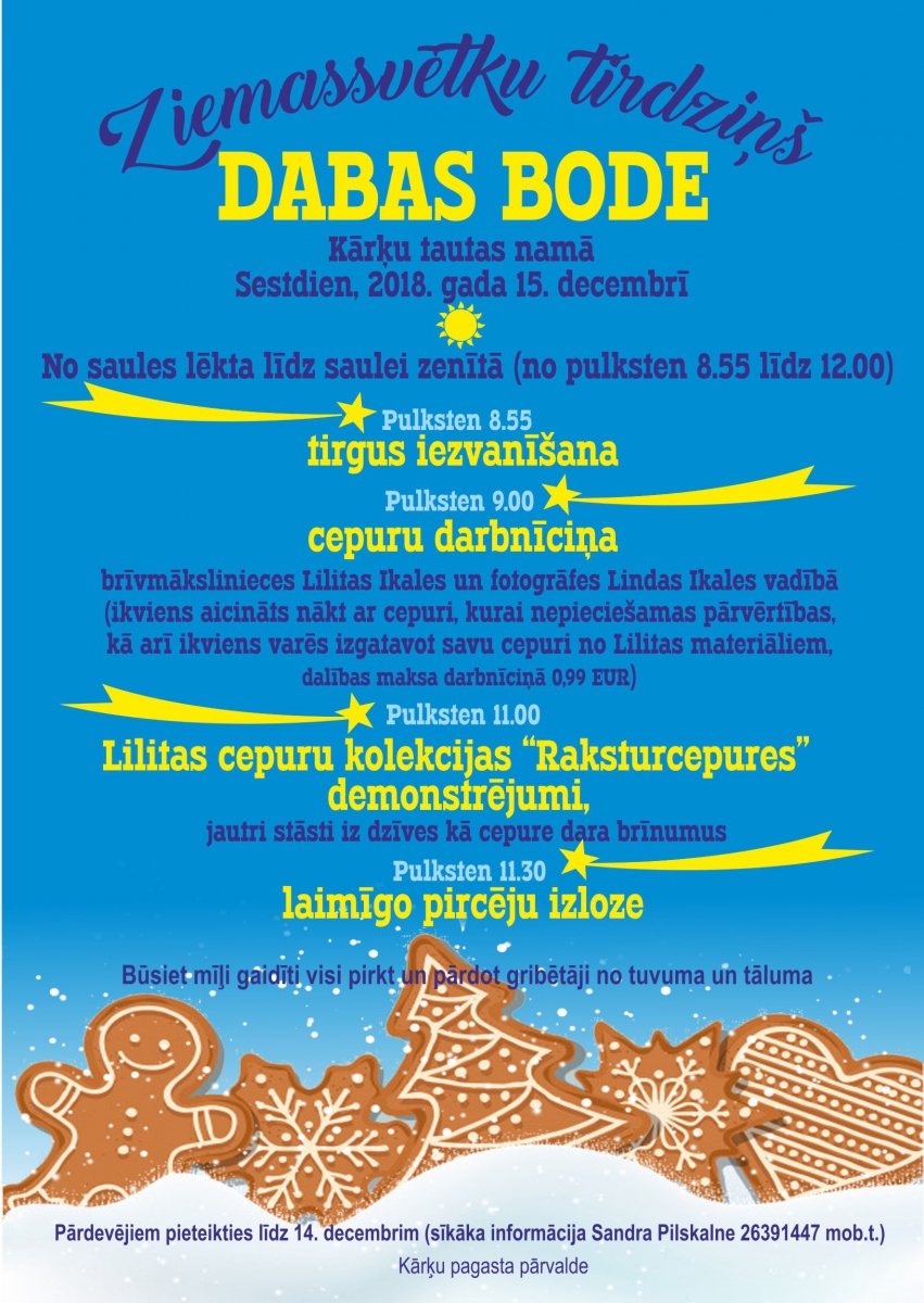 Sestdien, 15. decembrī no saullēkta līdz saulei zenītā, Valkas novada Kārķos notiks Ziemassvētku tirdziņš “Dabas bode”.
