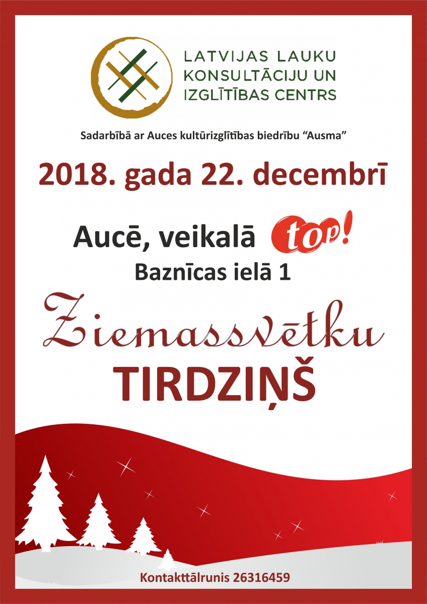 Datums: 22. Decembris, 2018Reģions: ZemgaleVieta: Top! veikalsAdrese: Skatīt karti lielākā izmērā Kontaktinformācija: Zaiga Vismane 29159059; Raimonda Ribikauska 26316459Reģions filtram: * Auces novads