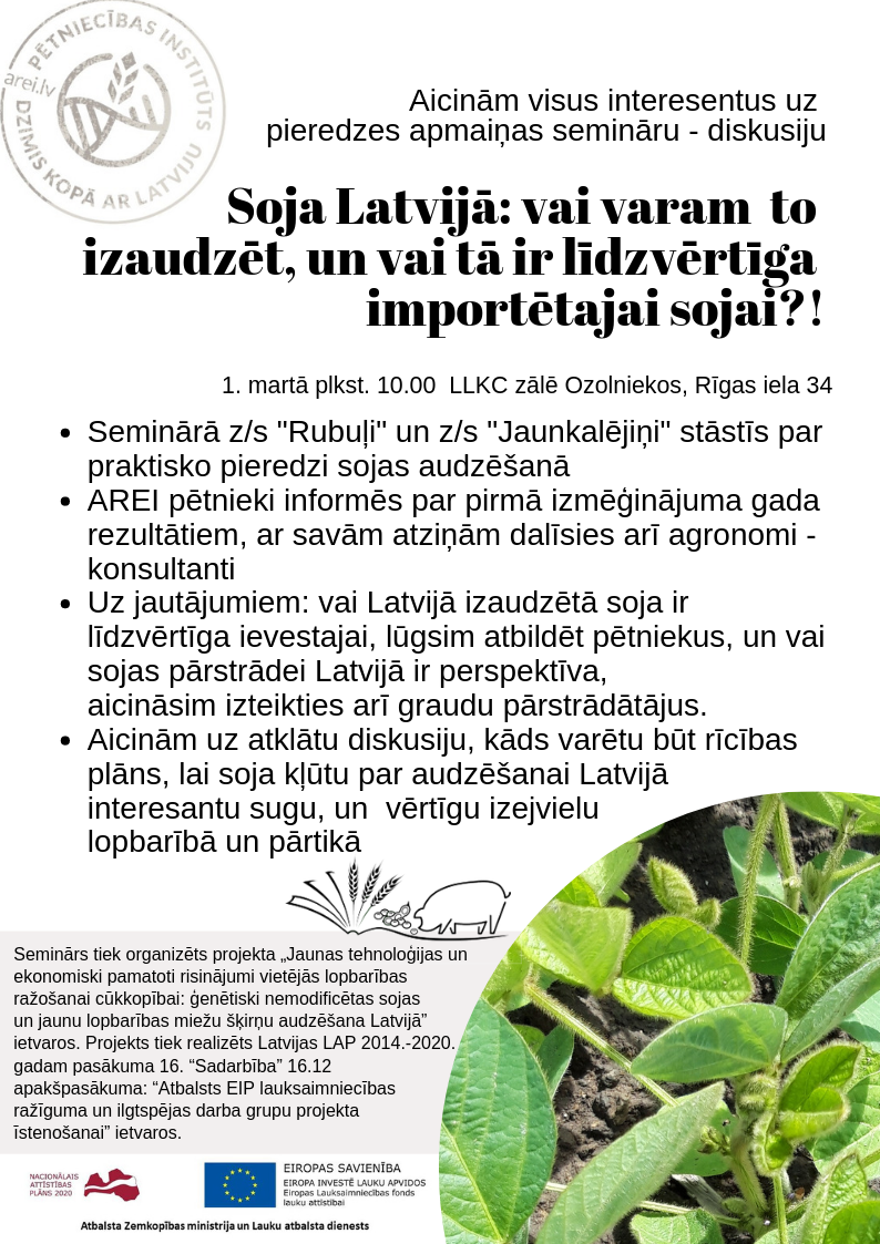 LLKC zālē Ozolniekos, Rīgas iela 34. , 1. martā plkst. 10.00, tiek organizēts seminārs "Soja Latvijā: vai varam to izaudzēt, un vai tā ir līdzvērtīga importētajai sojai?!"