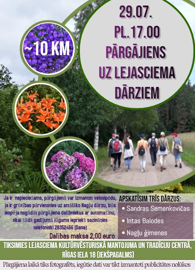 Pārgājiens uz skaistiem Lejasciema dārziem. 29.jūlijā 17:00, 10 km, var ar velosipēdu, apskatīsim trīs dārzus. Dalības maksa 2.00 EUR.