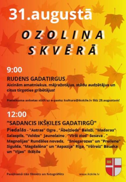 31.augustā Ozoliņa skvērā no plkst. 9.00 – RUDENS GADATIRGUS.