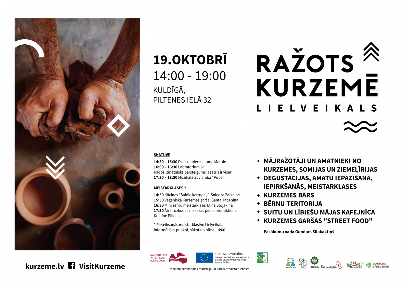 Lielveikalā darbosies ne tikai tirdzniecības zāle, bet arī jauno amatu meistaru dizaina preču veikaliņš. Lībiešu un suitu saimnieces piedāvās dažādus gardumus atvērtajā mājas kafejnīcā. Gardumu meistares ik stundu aicinās uz meistarklasēm, lai gūtu ieskatu dažādu gardumu gatavošanā. Kurzemes amatu meistari un pasākumu organizatori būs parūpējušies par nodarbēm bērniem - mālu mīcīšanu, darbnīcām patrepē un pie Pastariņa muzeja. Uz skatuves kāps dziesminiece Lauma Matule un muzikālā apvienība “Pupa” ar skanīgām un jautrām koncertprogrammām. Festivāls “Teātris ir visur” piedāvās radoši zinātnisku pārsteigumu Labratorium.lv. Pasākuma laikā pie lielveikala darbosies Street food, kurā būs iespēja baudīt Kurzemes garšas šefpavāra Aigara Sīļa izpildījumā, klātienē vērot zivju kūpināšanu, kā arī nogaršot fonda “Viegli” ceptos kartupeļus. Pasākumu vadīs aktieris un režisors Gundars Silakaktiņš.