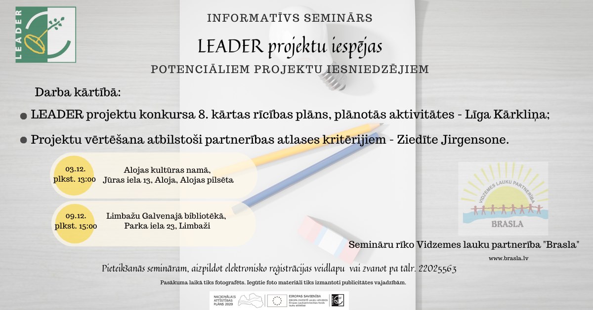 Vidzemes lauku partnerība "Brasla" organizē informatīvos seminārus projektu rakstītājiem par izsludināto LEADER projektu konkursa VIII kārtu uzņēmējdarbības atbalstam.