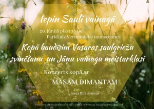 20. jūnijā plkst. 18:00 Aiz Vecumnieku tautas nama parkā norisināsies Vasaras saulgriežu koncerts “Iepin sauli vainagā” un ziedu vainagu meistarklases floristu studijas vadītājas Līgas Lauriņas pavadībā.