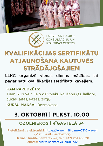 Latvijas Lauku konsultāciju un izglītības centrs saskaņā ar Padomes Regulu (EK) Nr. 1099/2009, par dzīvnieku aizsardzību nonāvēšanas laikā un MK noteikumiem Nr. 21 „Kaušanai paredzēto lauksaimniecības dzīvnieku aizsardzības prasības” organizē apmācības, lai pagarinātu kvalifikācijas sertifikātu kāvējiem, kas veic lielo dzīvnieku kaušanu (t.i. liellopi, cūkas, aitas, kazas, zirgi),