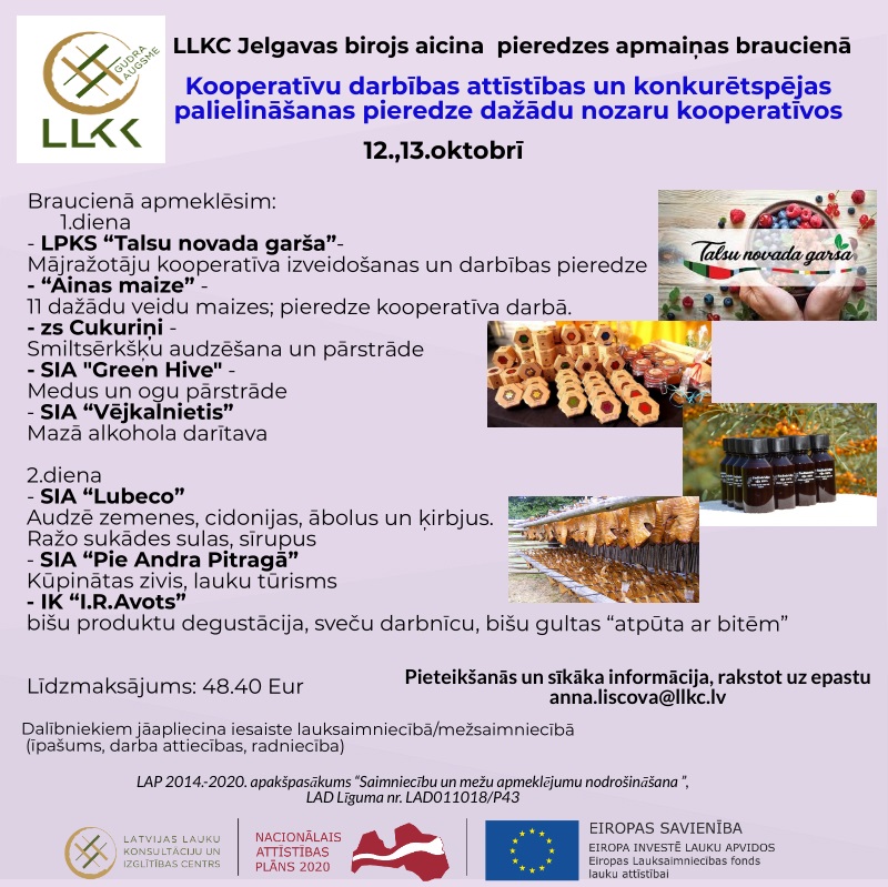 LKC Jelgavas konsultāciju birojs aicina 2 dienu pieredzes apmaiņas braucienā 12. un 13.oktobrī "Kooperatīvu darbības attīstības un konkurētspējas palielināšanas pieredze dažādu nozaru kooperatīvos". Iepriekšēja pieteikšanās obligāta.