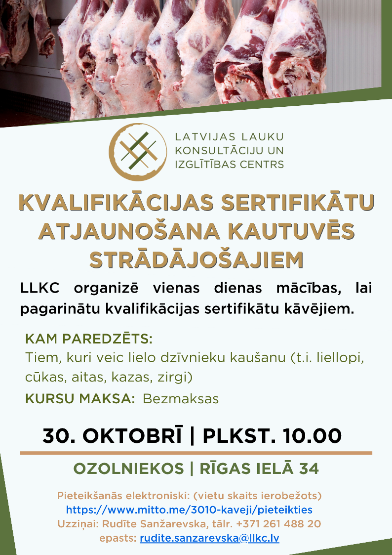 Latvijas Lauku konsultāciju un izglītības centrs saskaņā ar Padomes Regulu (EK) Nr. 1099/2009, par dzīvnieku aizsardzību nonāvēšanas laikā un MK noteikumiem Nr. 21 „Kaušanai paredzēto lauksaimniecības dzīvnieku aizsardzības prasības” organizē apmācības, lai pagarinātu kvalifikācijas sertifikātu kāvējiem, kas veic lielo dzīvnieku kaušanu (t.i. liellopi, cūkas, aitas, kazas, zirgi),