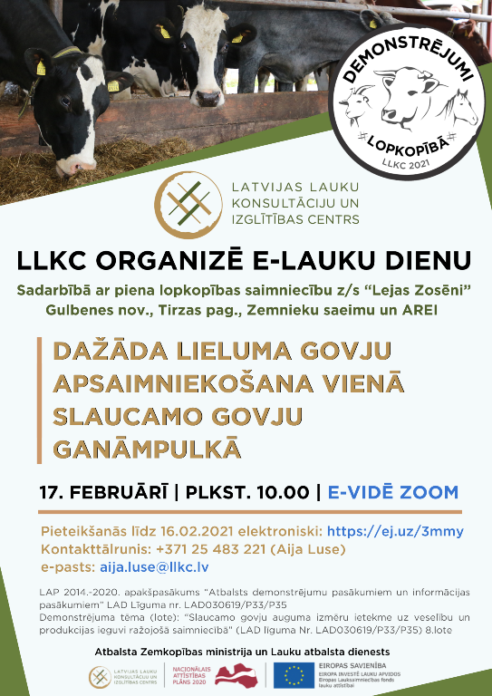 LLKC sadarbībā ar piena lopkopības saimniecību z/s “Lejas Zosēni” Gulbenes novada Tirzas pagastā, Zemnieku saeimu un AREI aicina apmeklēt demonstrējuma lauka dienu par dažāda lieluma govju apsaimniekošanu vienā slaucamo govju ganāmpulkā piena lopkopības saimniecībā.