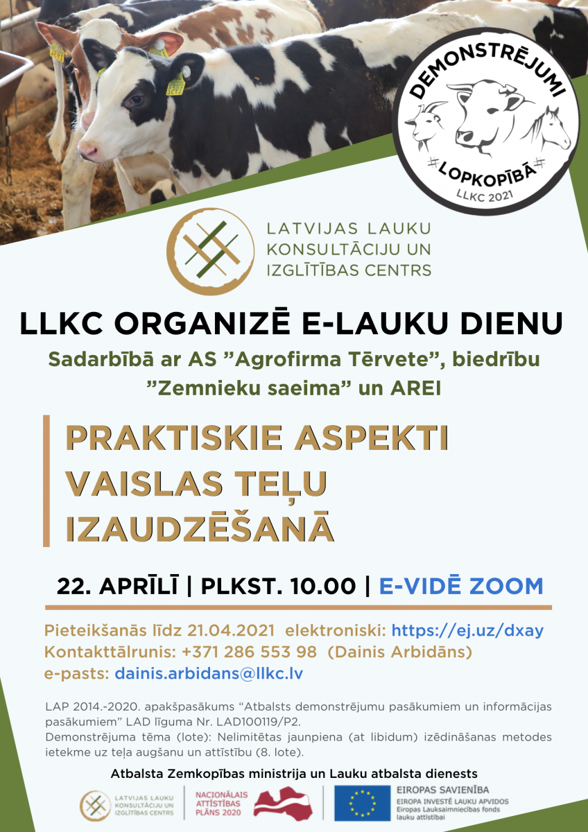 LLKC sadarbībā ar AS ”Agrofirma Tērvete”, biedrību ”Zemnieku saeima” un AREI aicina apmeklēt e-lauka dienu par praktiskiem risinājumiem, audzējot teles piensaimniecības ganāmpulkam.