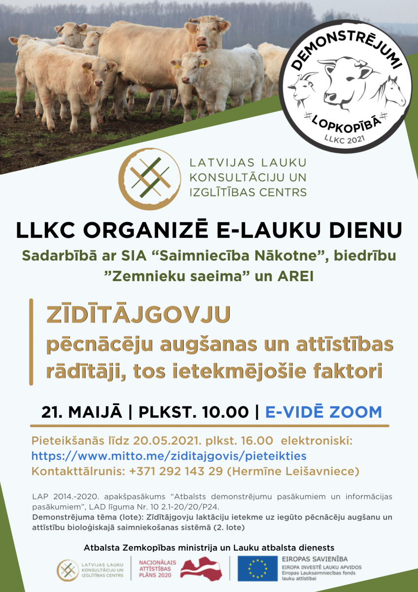 Lūdzam pasākumam pieteikties līdz 20.05.2021.  plkst. 16.00 elektroniskihttps://www.mitto.me/ziditajgovis/pieteikties Papildu informācija pa tālruni 29214329, Hermīne Leišavniece, LLKC Balvu KB konsultante lopkopībā.