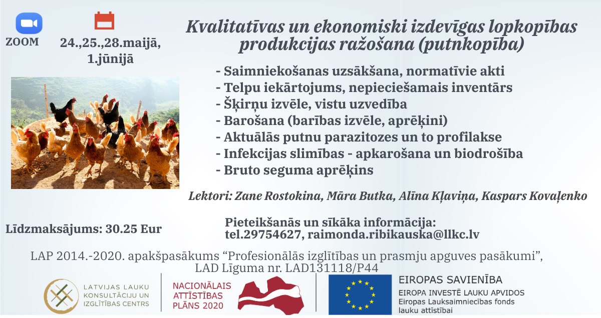 Mācības 24.,25.,28.maijā un 1.jūnijā par putnkopību kopā ar nozares speciālistiem, sākot ar ganāmpulka izveidošanu līdz veterinārmedicīnai un ražošanas izmaksu aprēķinam.