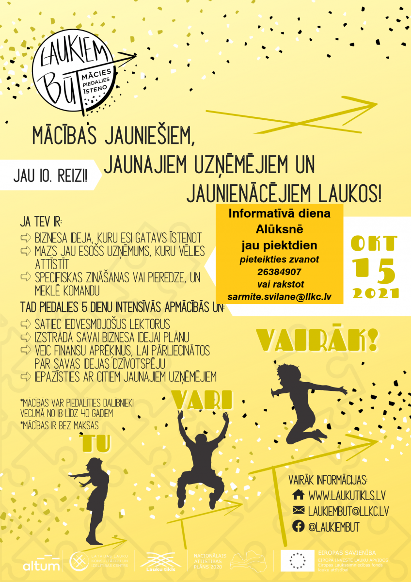 Alūksnes KB organizē informatīvo dienu VLT aktivitātei "Atbalsts lauku jauniešiem uzņēmējdarbības veicināšanā". Pasākums notiks attālināti ZOOM platformā 15.10.2021. plkst 10:00.