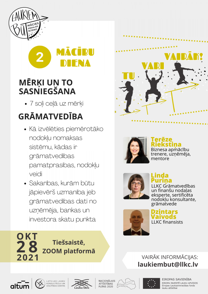 10:00 - 11:30 Mērķi un to sasniegšana - "7 soļi ceļā uz mērķi". Lektore Terēze Riekstiņa (biznesa apmācību trenere, uzņēmēja, mentore).
