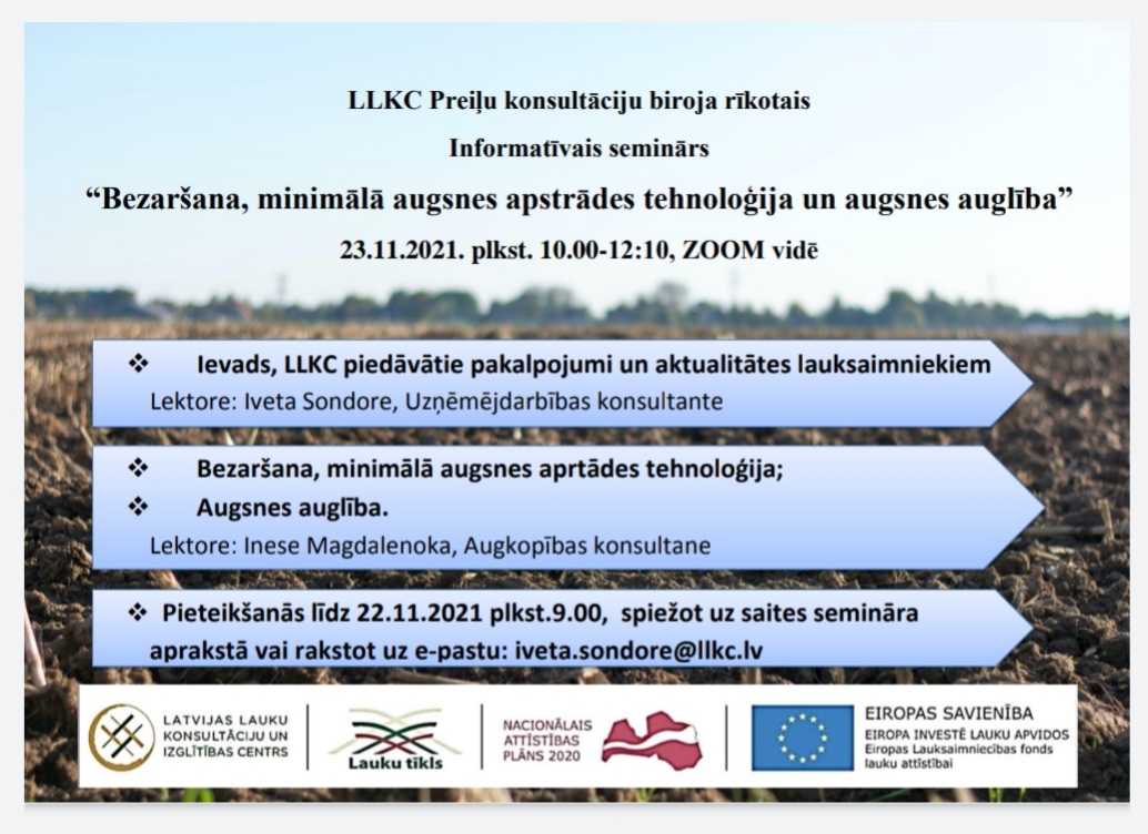 Preiļu konsultāciju biroja informatīvas seminārs Lauksaimniekiem "Bezaršana un minimālā augsnes apstrādes tehnoloģija, augsnes auglība". Seminārs notiks tiešsaites platformā ZOOM 2021.gada 23.novembrī.