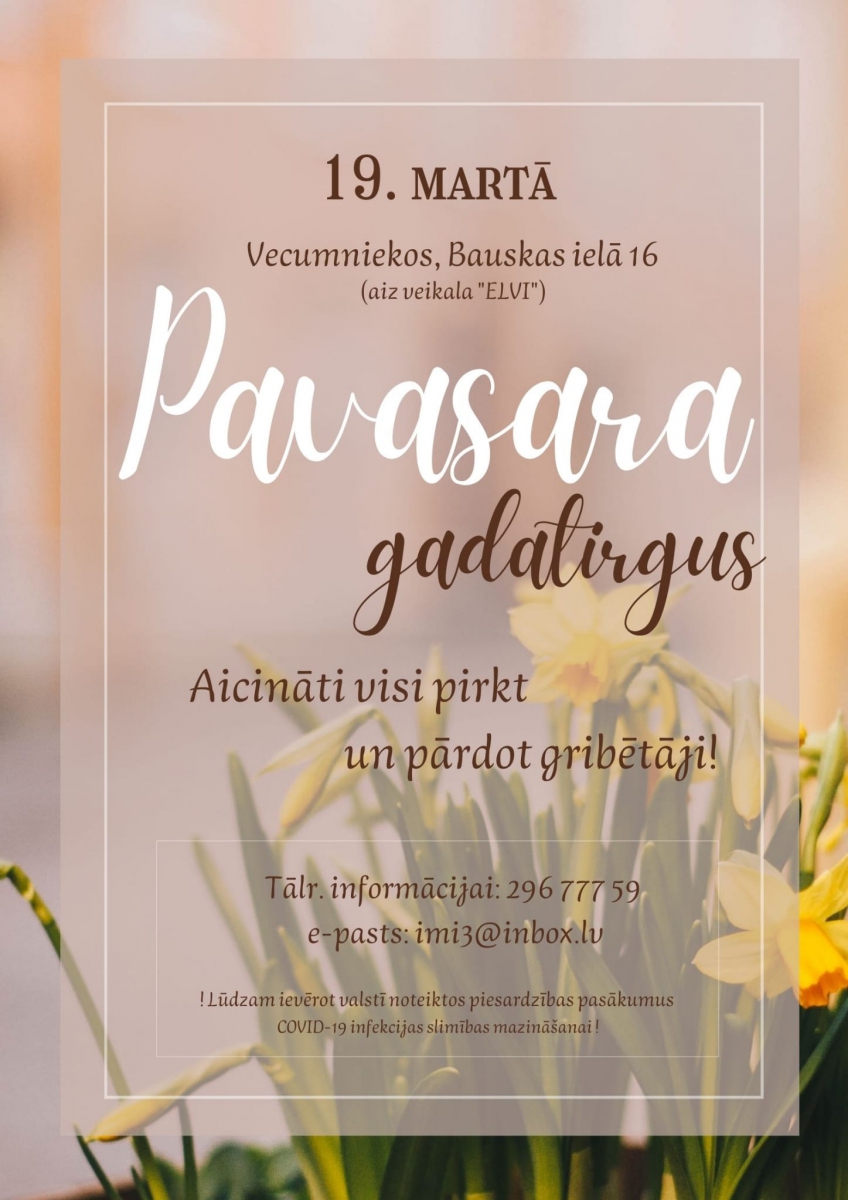 Tiek rīkots ”Pavasara gadatirgus” 19 martā, Vecumniekos, Bauskas ielā 16.( Vecumnieku tirgus laukumā aiz veikala Elvi)
