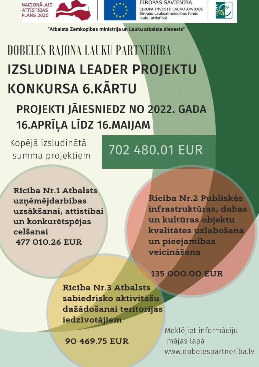 Biedrība “Dobeles rajona lauku partnerība” izsludina atklāta konkursa projektu iesniegumu pieņemšanas 6.kārtu Sabiedrības virzītas vietējās attīstības stratēģijas ieviešanai.
