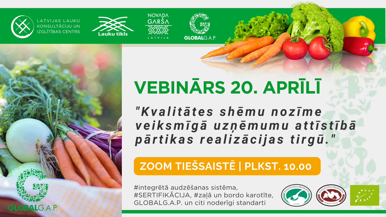 Lai pilnveidotu zināšanas par dažādu pārtikas kvalitātes shēmu sniegtajiem ieguvumiem, atšķirībām un tendencēm, kā arī aktualizētu prasības ražotāju iekļūšanai veikalu ķēdēs, ikviens interesents aicināts piedalīties tiešsaistes vebinārā “Kvalitātes shēmu nozīme veiksmīgā uzņēmumu attīstībā pārtikas realizācijas tirgū”.