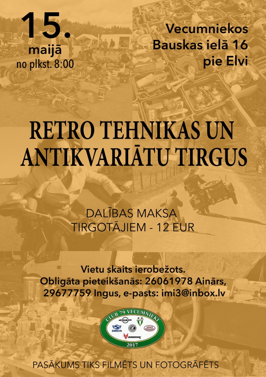 Retro tehnikas un antikvariātu tirgus notiks 15. maijā no plkst 8:00. Vecumniekos, Bauskas ielā 16 pie veikala “Elvi”.