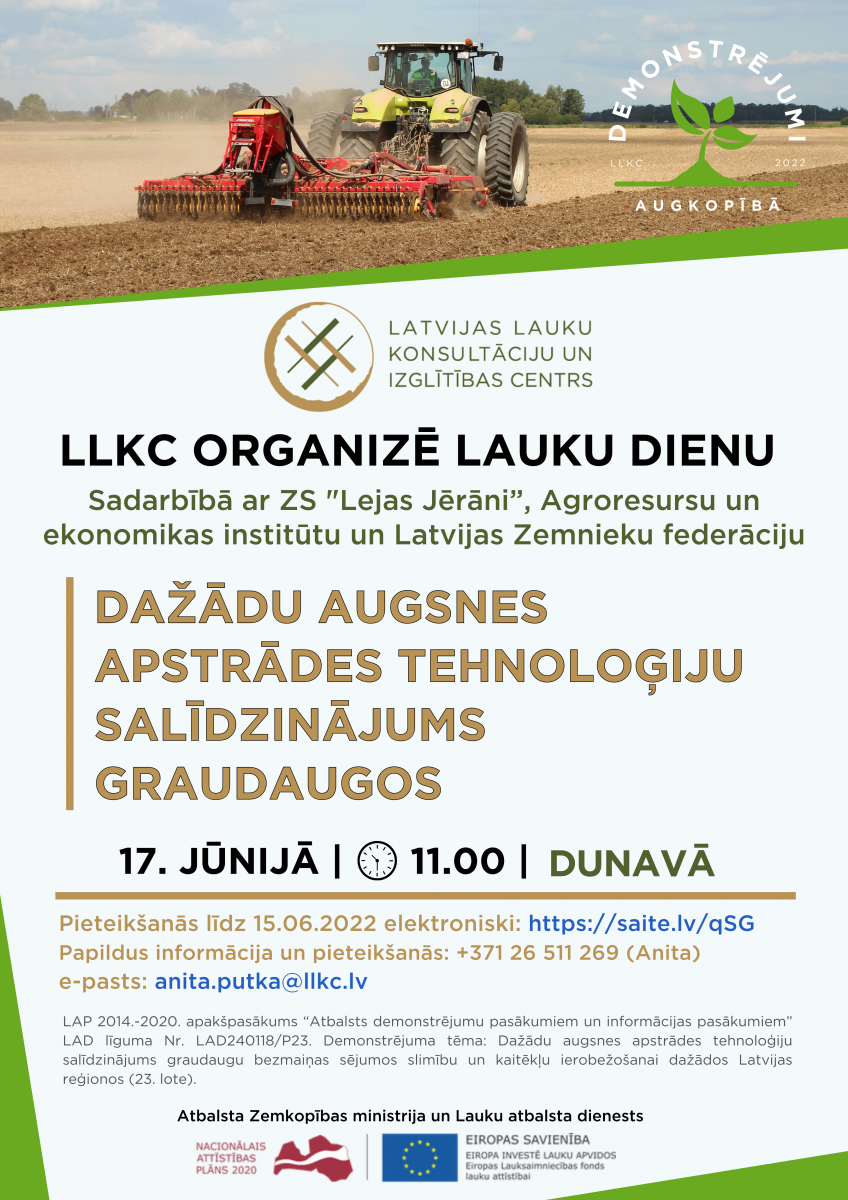 LLKC sadarbībā ar z/s“ Lejas Jērāni” (Dunavas pagasts, Jēkabpils novads), Agroresursu un ekonomikas institūtu un Latvijas Zemnieku federāciju aicina 17. jūnijā apmeklēt lauka dienu “Dažādu augsnes apstrādes tehnoloģiju salīdzinājums graudaugu bezmaiņas sējumos slimību un kaitēkļu ierobežošanai“.