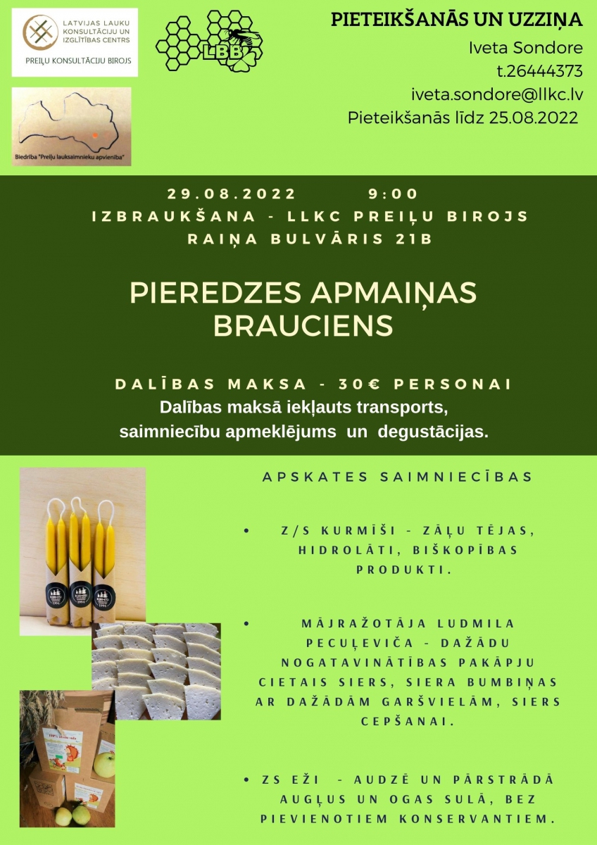 Latvijas lauku konsultācju un izglītības centra Preiļu konsultāciju birojs sadarbībā ar biedrību "Preiļu lauksaimnieku apvienība" un Latvijas biškopības biedrību organizē pieredzes apmaiņas braucienu.