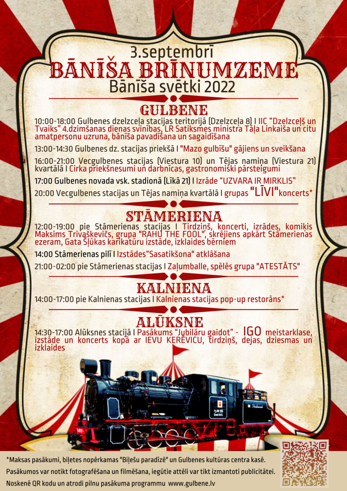 3. septembrī, Gulbenē, Stāmerienā, Kalnienā un Alūksnē ikviens varēs piedzīvot īstus brīnumus. Arī pats bānītis jau 119 gadus ir viens no lielākajiem Gulbenes un Alūksnes novadu brīnumiem, kurš šo gadu laikā piedzīvojis pārsteidzošas satikšanās un neizsakāmu prieku, brīnumainus cilvēkus un daudzveidīgus notikumus. Esiet gaidīti kopā svinēt Bānīša 119. dzimšanas dienas svētkus “Bānīša brīnumzeme”!