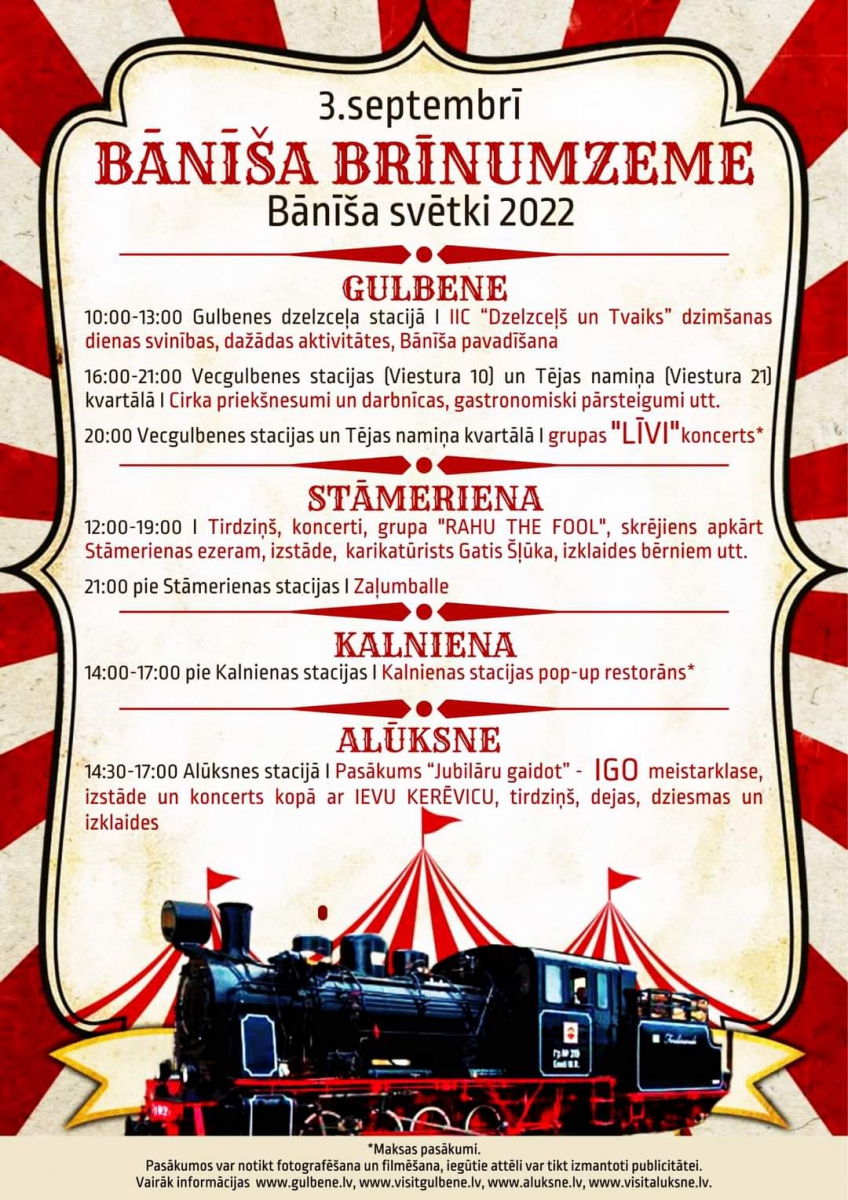 SIA "Gulbenes-Alūksnes bānītis" organizē Bānīša svētkus kas sākas 10:00 Gulbenes dzelzceļa stacijā un noslēgsies Alūksnes stacijā 17:00. Visas dienas garumā dažādi pasākumi, aktivitātes, darbnīcas, tirdziņš, dejas , dziesmas, izklaides.