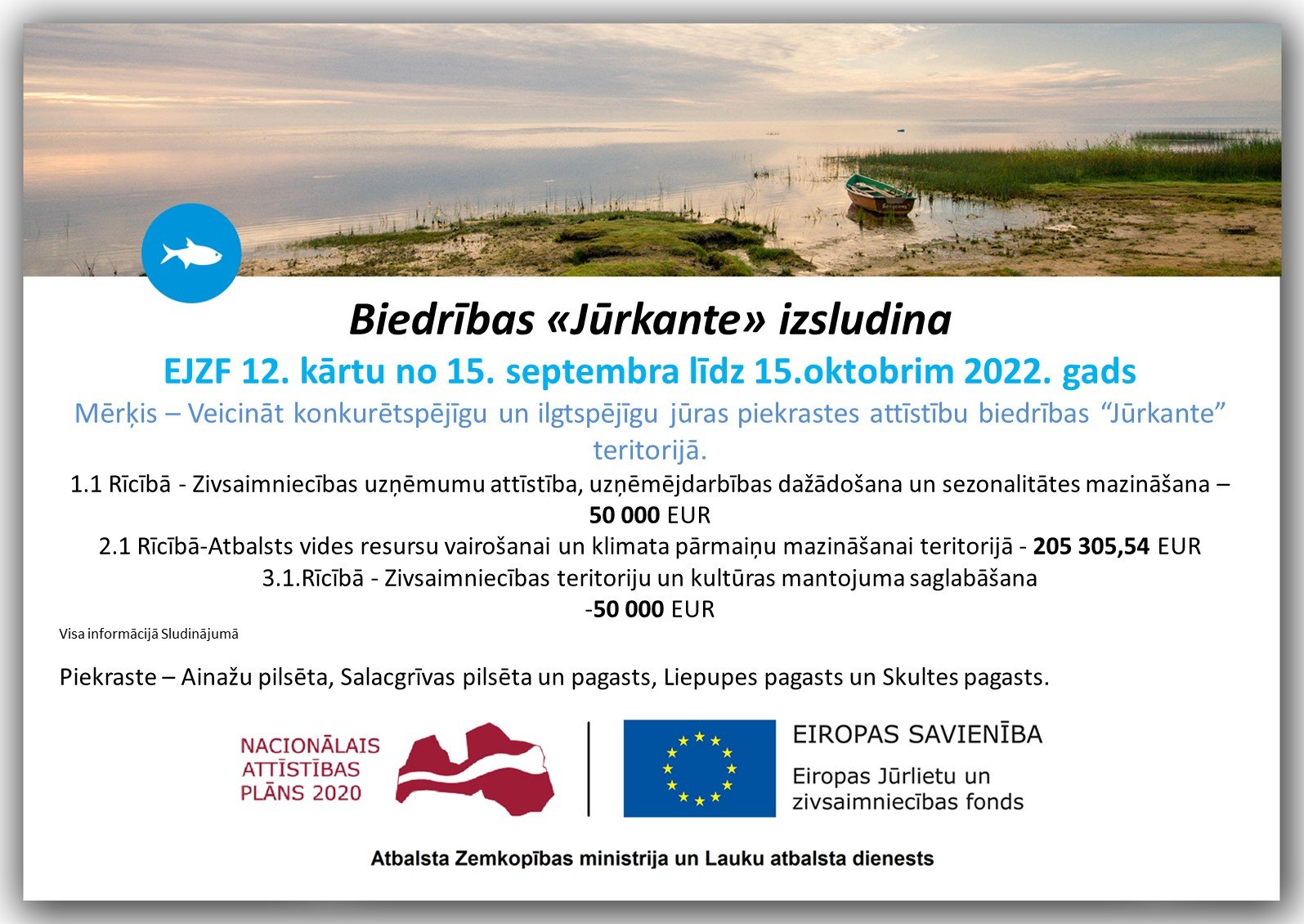Biedrība „Jūrkante” izsludina atklāta konkursa projektu iesniegumu pieņemšanas 12.kārtu Eiropas jūrlietu un zivsaimniecības fonda (EJZF) pasākumā 43.02 „Sabiedrības virzītas vietējās attīstības stratēģiju īstenošana”