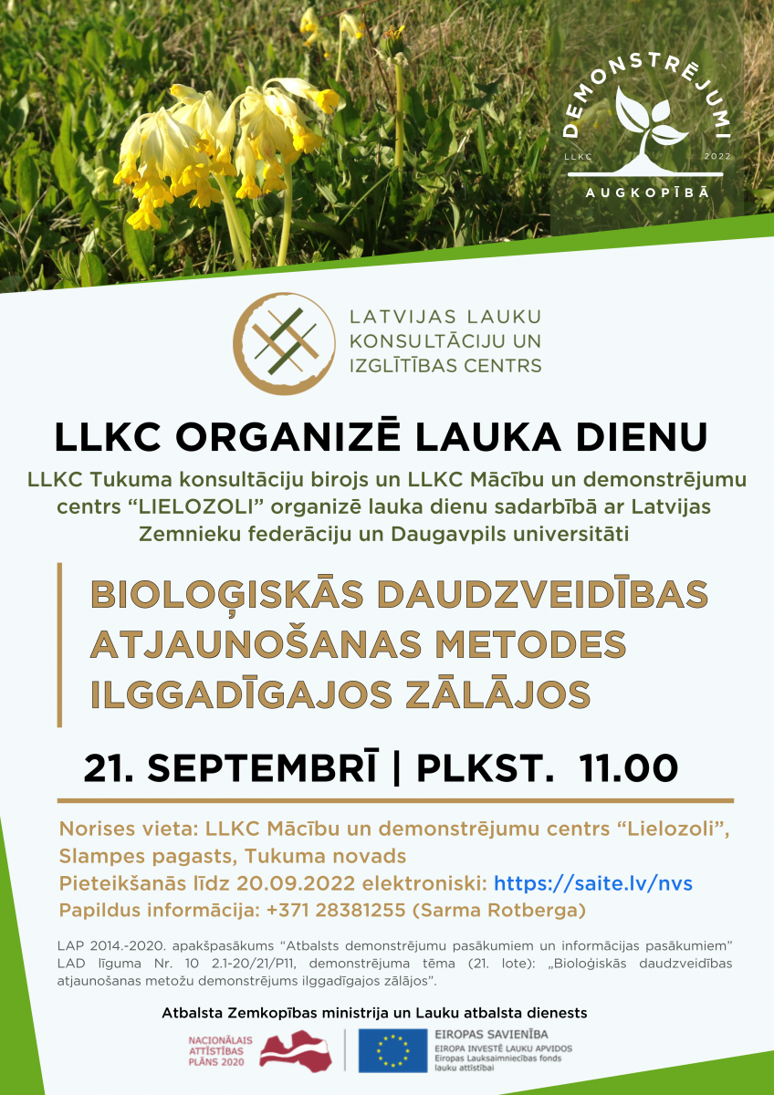LLKC Tukuma konsultāciju birojs un LLKC Mācību un demonstrējumu centrs “Lielozoli” sadarbībā ar Latvijas Zemnieku federāciju un Daugavpils universitāti aicina apmeklēt lauka dienu, lai nodemonstrētu un izvērtētu ilggadīgo zālāju bioloģiskās daudzveidības atjaunošanas metodes un to efektivitāti.