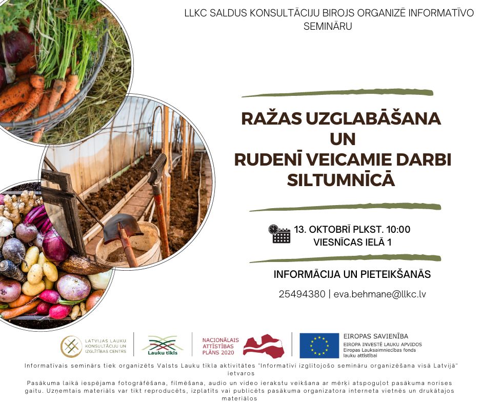 LLKC Saldus konsultāciju birojs aicina uz bezmaksas informatīvo semināru "Ražas uzglabāšana un rudenī veicamie darbi siltumnīcā" . Semināra laikā būs iespēja uzzināt arī par Saldus KB piedāvātajiem pakalpojumiem un plānotajām aktivitātēm.