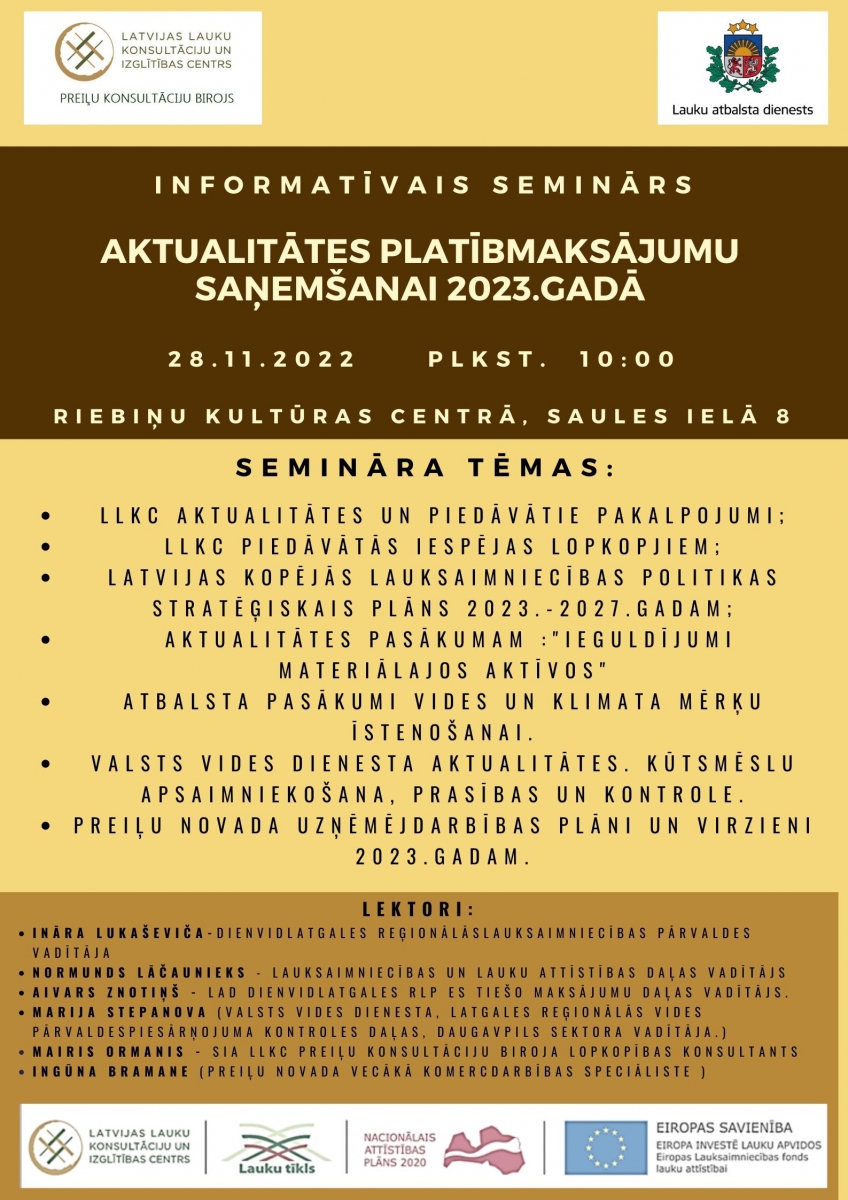 Preiļi | 28.11.2022 | Informatīvais seminārs: "Aktualitātes platībmaksājumu saņemšanai 2023.gadā"