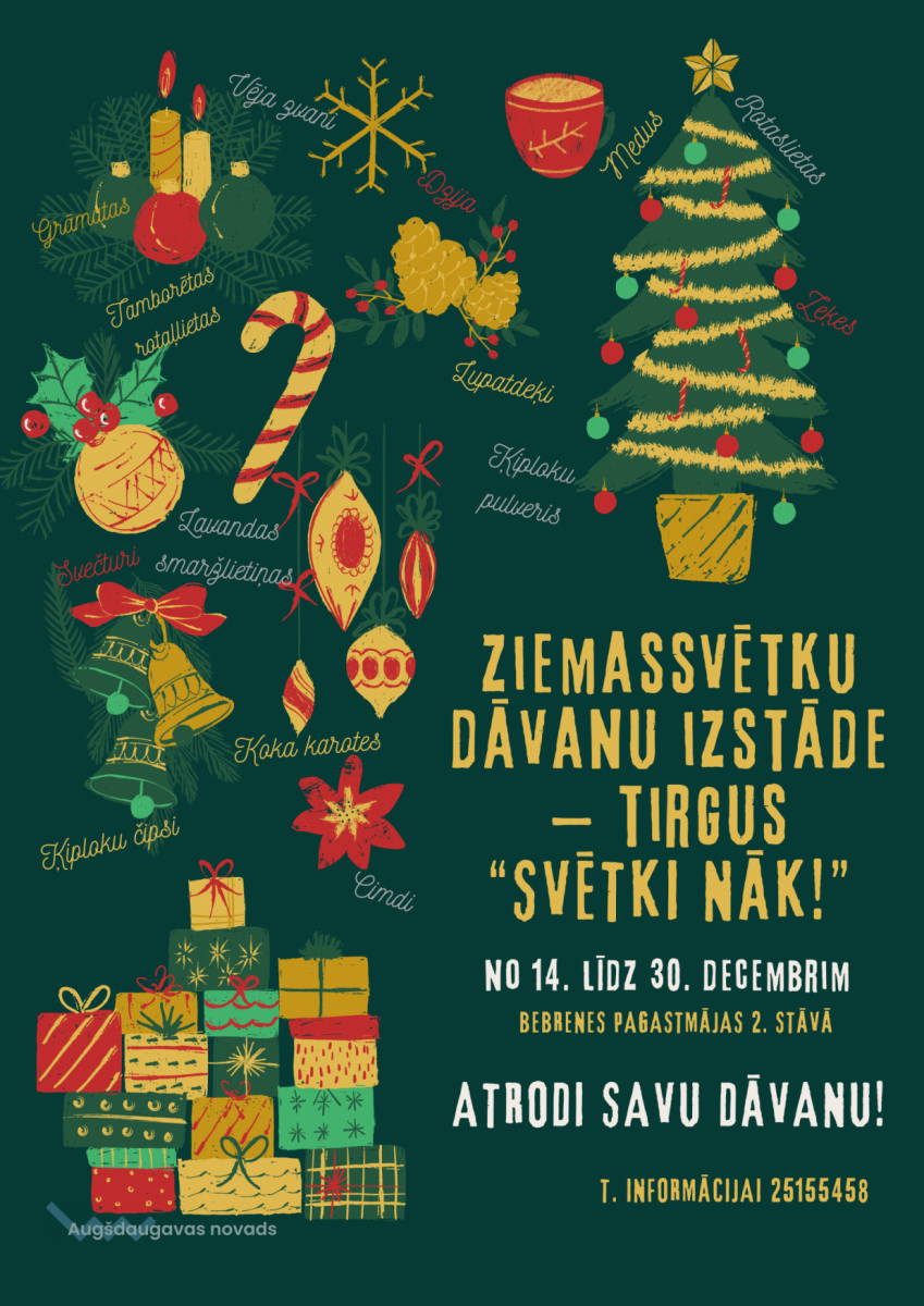 Datums: 14. Decembris, 2022 līdz 30. Decembris, 2022Reģions: LatgalesZiemassvētku dāvanu izstāde Kontaktinformācija: Tālr. 25155458Reģions filtram: Daugavpils