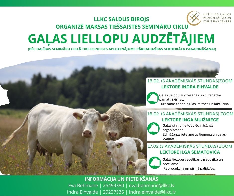 LLKC Saldus konsultāciju birojs organizē tiešsaistes maksas semināru ciklu gaļas liellopu audzētājiem.