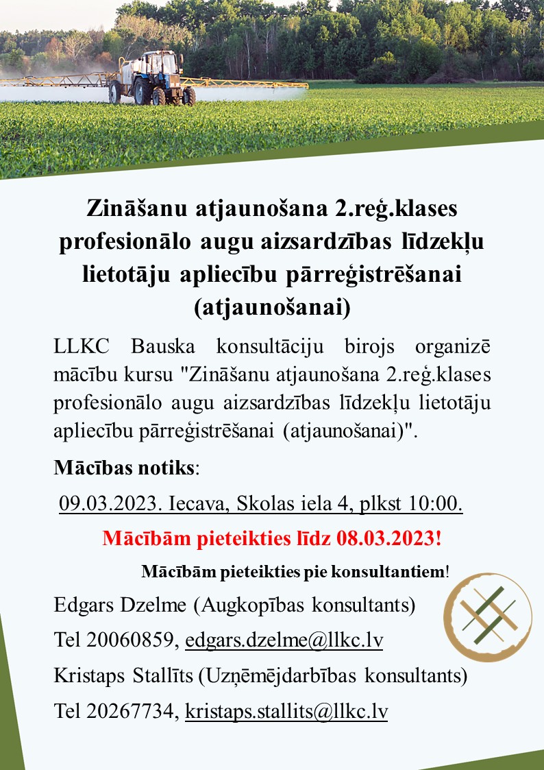 LLKC Bauska konsultāciju birojs organizē mācību kursu "Zināšanu atjaunošana 2.reģ.klases profesionālo augu aizsardzības līdzekļu lietotāju apliecību pārreģistrēšanai (atjaunošanai)".