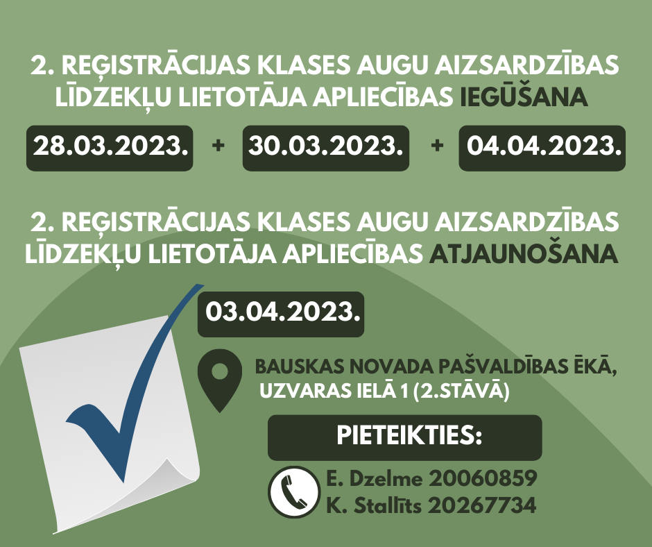 LLKC Bauska konsultāciju birojs organizē mācību kursu "Zināšanu atjaunošana 2.reģ.klases profesionālo augu aizsardzības līdzekļu lietotāju apliecību pārreģistrēšanai (atjaunošanai)".
