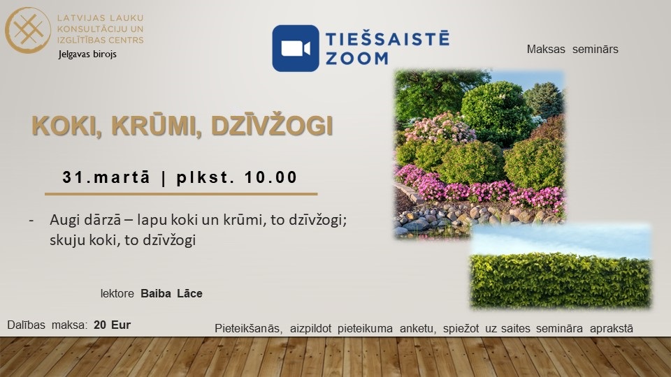 31.03 plkst. 10.00 – 13:15 Koki, krūmi, dzīvžogi dārzā