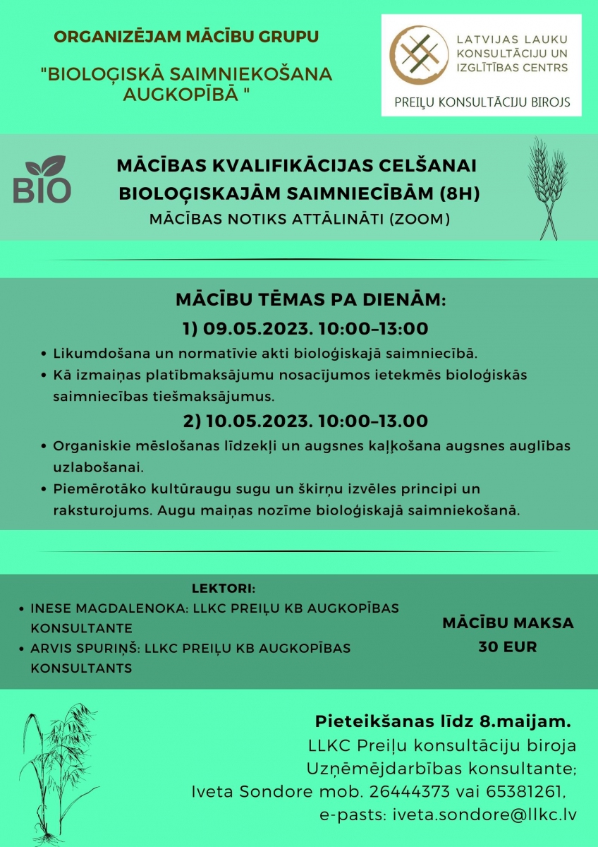 LLKC Preiļu birojs organizē mācību grupu kvalifikācijas celšanai bioloģiskajām augkopības saimniecībām.