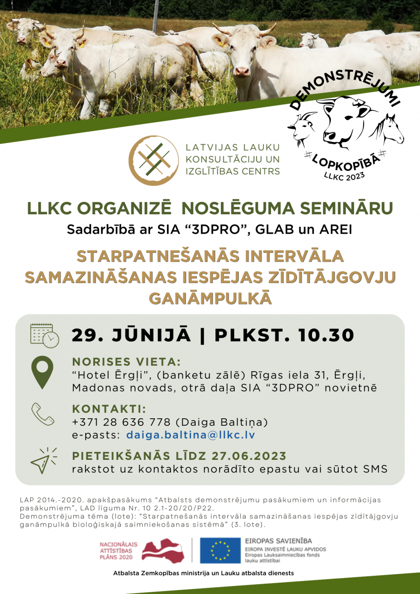 LLKC sadarbībā ar SIA “3DPRO”, GLAB un AREI 29. jūnijā  aicina apmeklēt demonstrējuma noslēguma semināru par starpatnešanās intervāla samazināšanas iespējām bioloģiskā saimniekošanā.